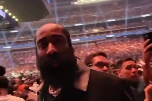 这人故意的吧离场时遭误认成勒布朗,哈登一脸不悦推开球迷!