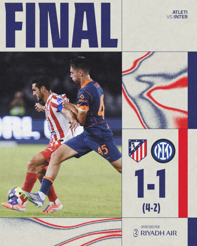 全场比赛结束,马德里竞技5-3击败国际米兰。