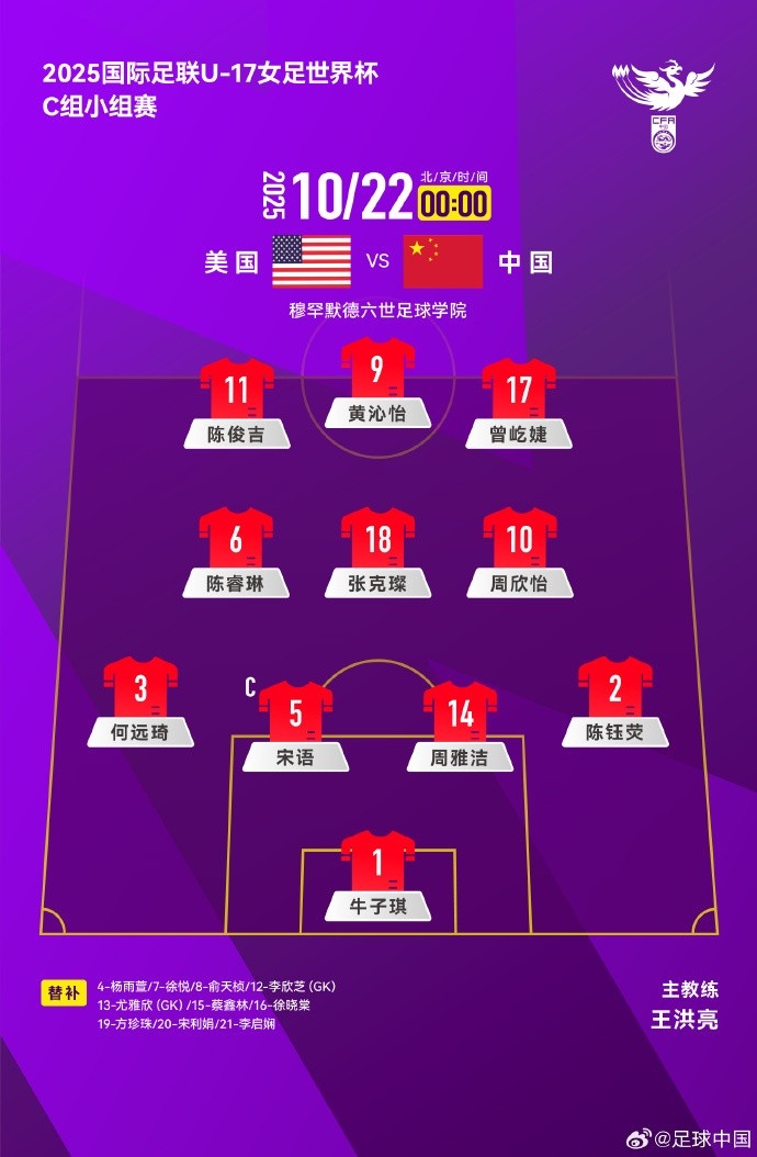 10月21日讯 2025国际足联U-17女足世界杯C组小组赛第2轮,美国队VS 中国队首发名单出炉!